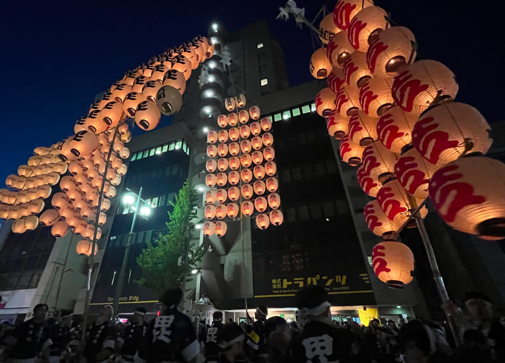 掛け声とともに提灯の灯りが夜空に浮かび上がる光景は、